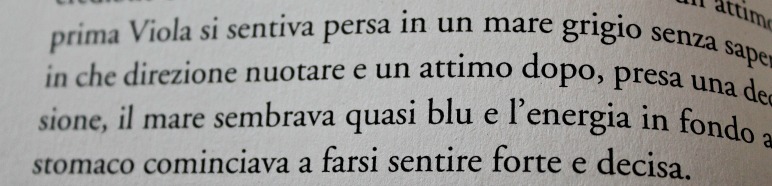 FRASE PREFERITA: E’ incredibile come cambino in fretta le sensazioni: un attimo prima Viola si sentiva persa in un mare grigio senza sapere in che direzione nuotare e un attimo dopo, presa una decisione, il mare sembrava quasi blu e l’energia in fondo allo stomaco cominciava a farsi sentire forte e decisa.