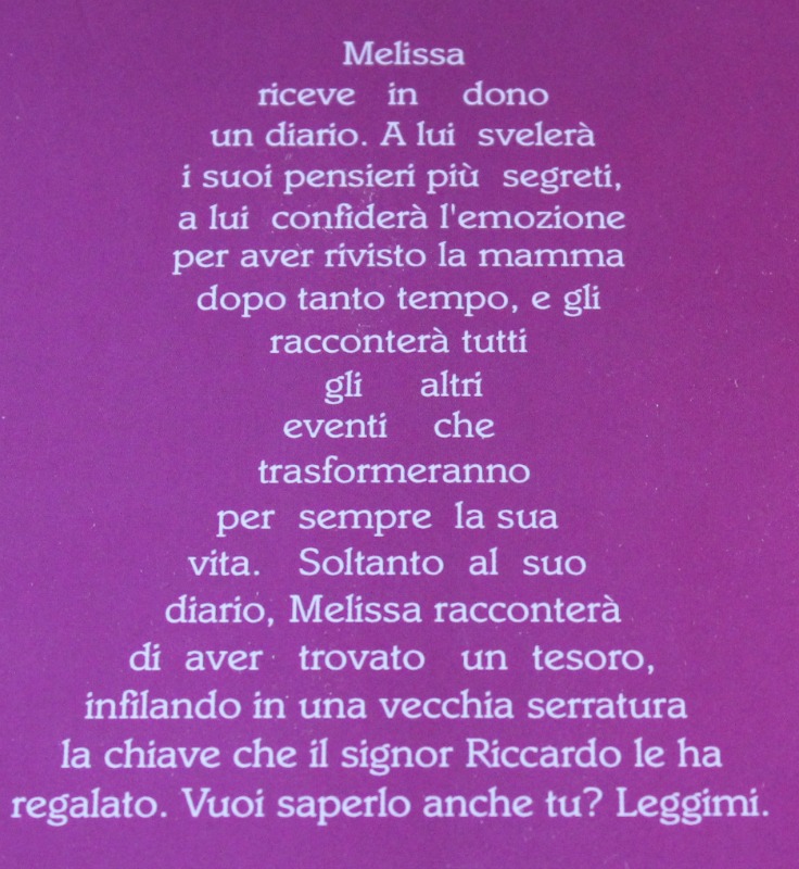 Ho incontrato il suo primo libro su Melissa l’anno scorso e, qualche tempo fa, ho avuto la bella sorpresa di scoprire che le avventure della piccola protagonista proseguivano in due altri volumi: “La misteriosa chiave di Melissa” e “Melissa e il tesoro di enigma”.